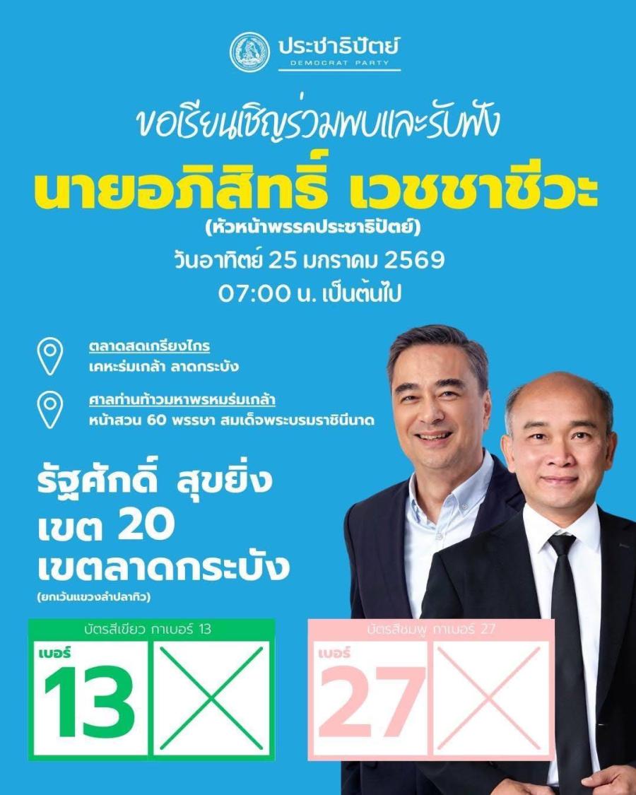 “อภิสิทธิ์–สกลธี” ลงพื้นที่ลาดกระบัง ช่วย “รัฐศักดิ์ สุขยิ่ง” หาเสียง พบประชาชนตลาดสดเกรียงไกร ชูนโยบายแก้เศรษฐกิจ–รื้อระบบประกันสังคม