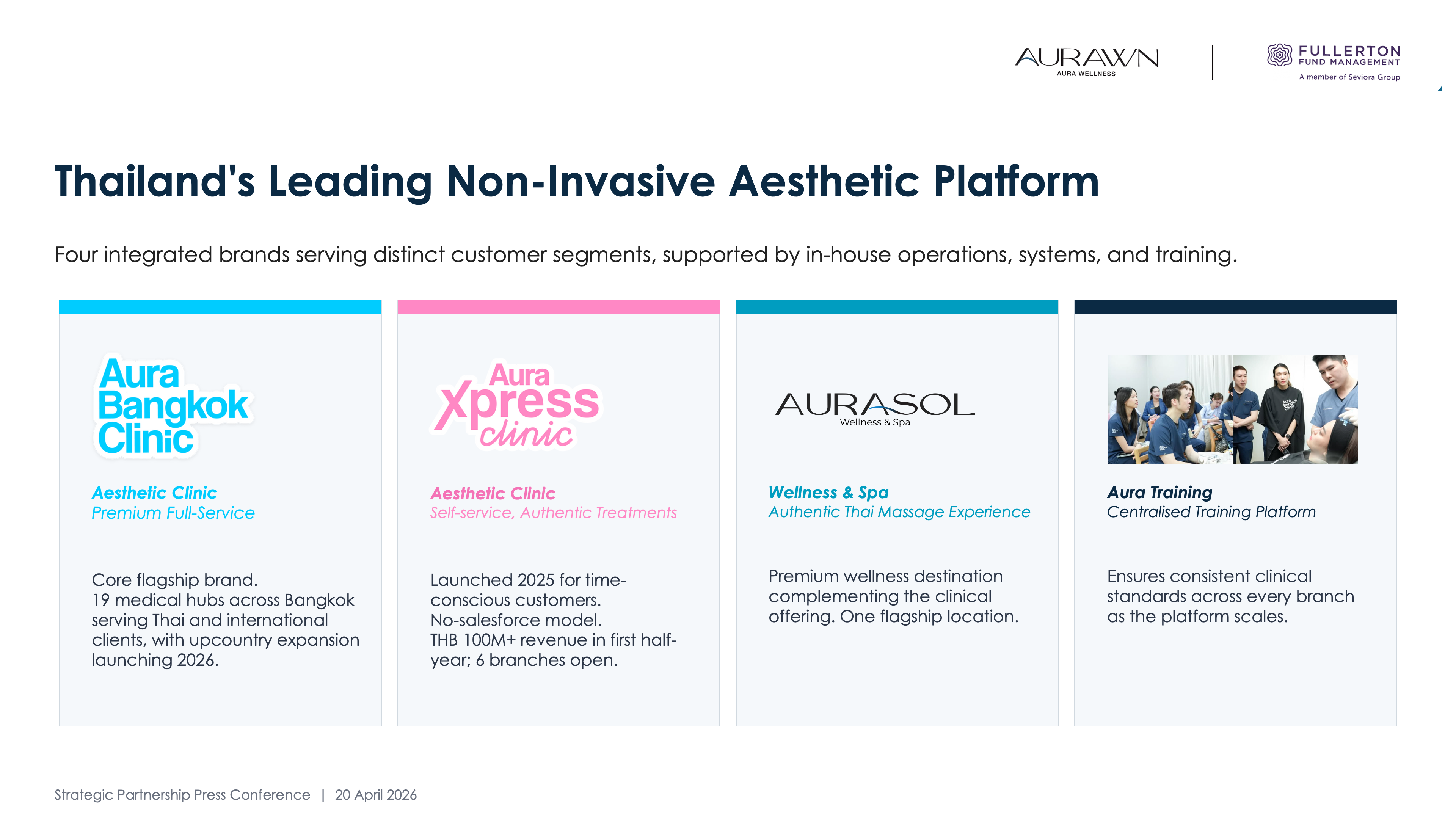 ทั้งนี้ การเชื่อมโยงความร่วมมือในครั้งนี้เกิดขึ้นโดยการสนับสนุนของคุณ Albert Wu จาก 10Bridge ซึ่งเป็น Local Partner ของ Fullerton Thai Private Equity และเป็นผู้มีบทบาทสำคัญในการประสานความร่วมมือระหว่างกองทุน Fullerton กับบริษัท Aura Wellness โดยเป้าหมายของเราคือการผลักดันให้ประเทศไทยเป็น Wellness Destination ของโลกอย่างแท้จริง ด้วยระบบบริหารจัดการที่โปร่งใส และได้มาตรฐานสากลที่เราวางรากฐานไว้ ซึ่งทำให้เราพร้อมรองรับการขยายตัวอย่างเป็นระบบในอนาคต”